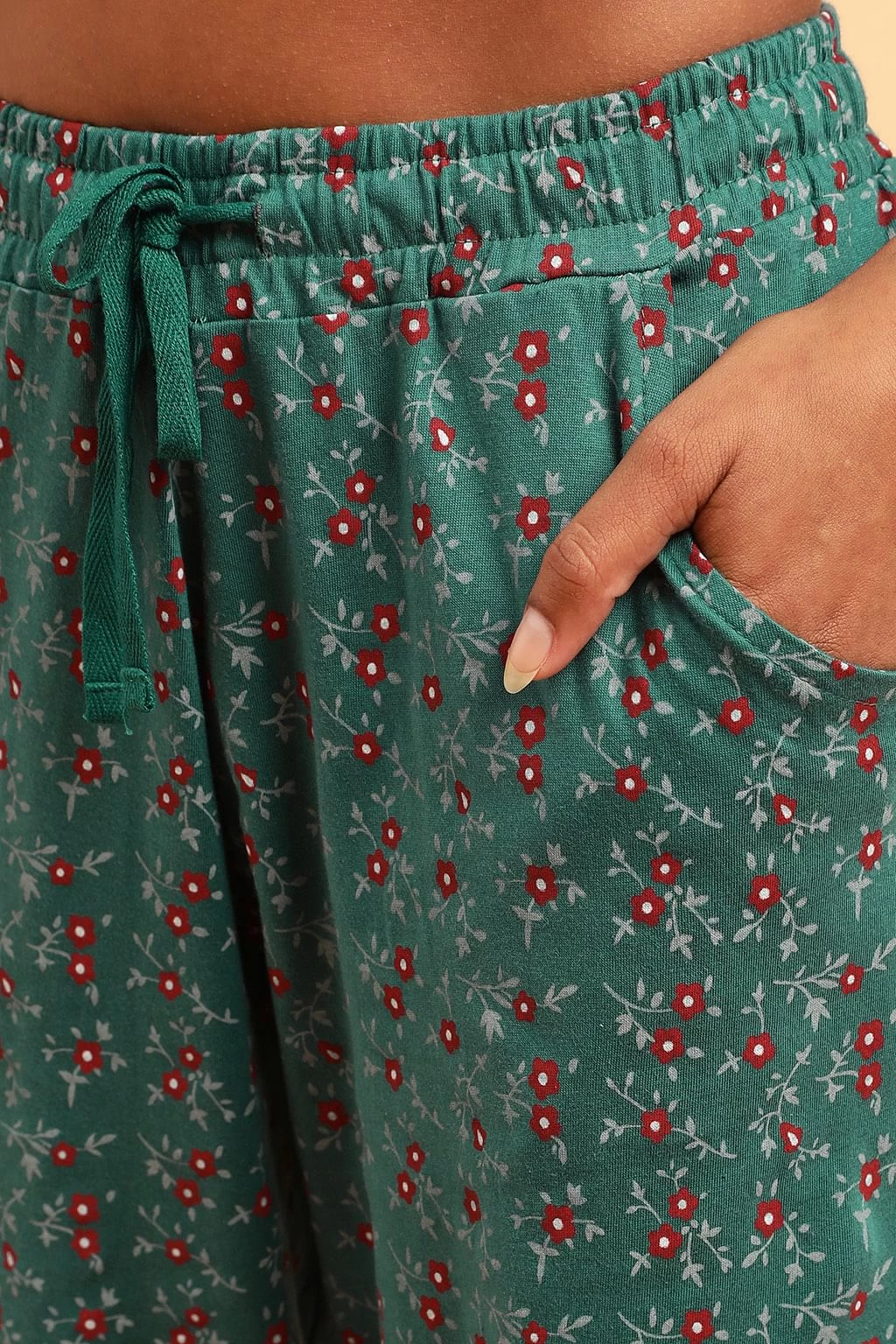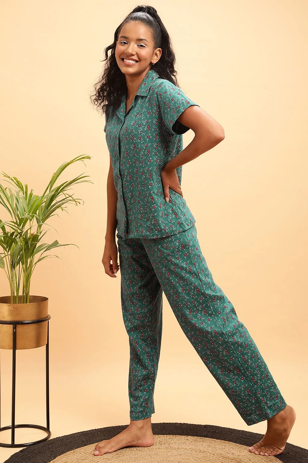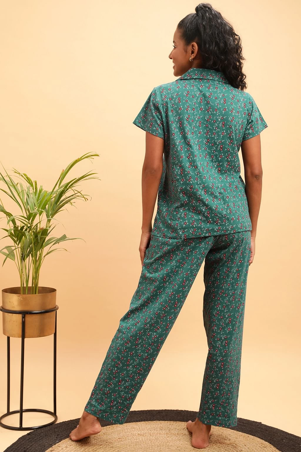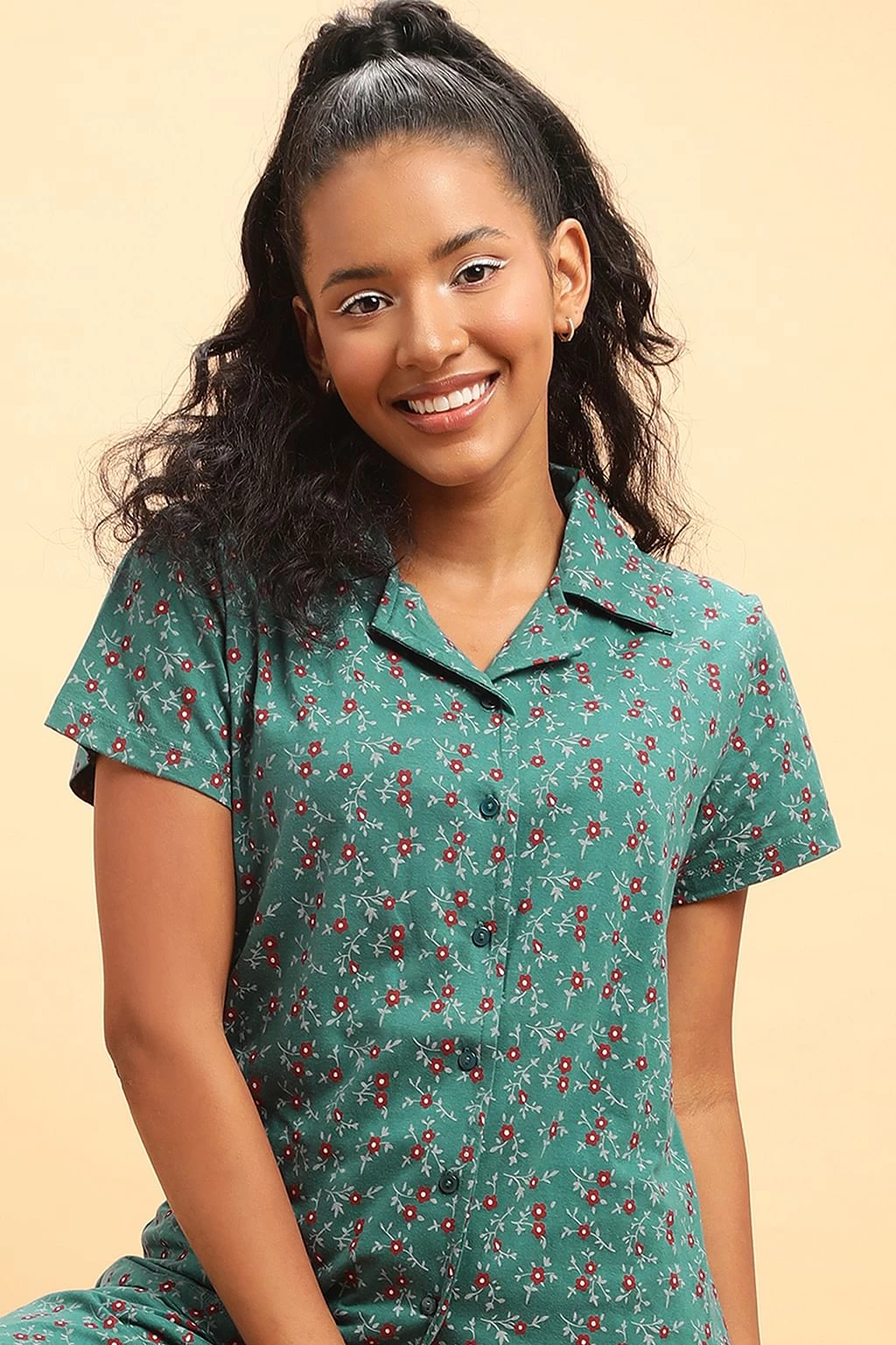 Pretty Florals Button Down Shirt & Pyjama Set In Teal Blue – 100% Cotton