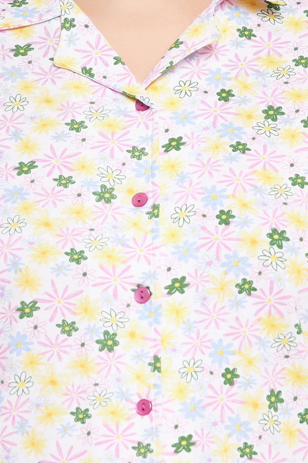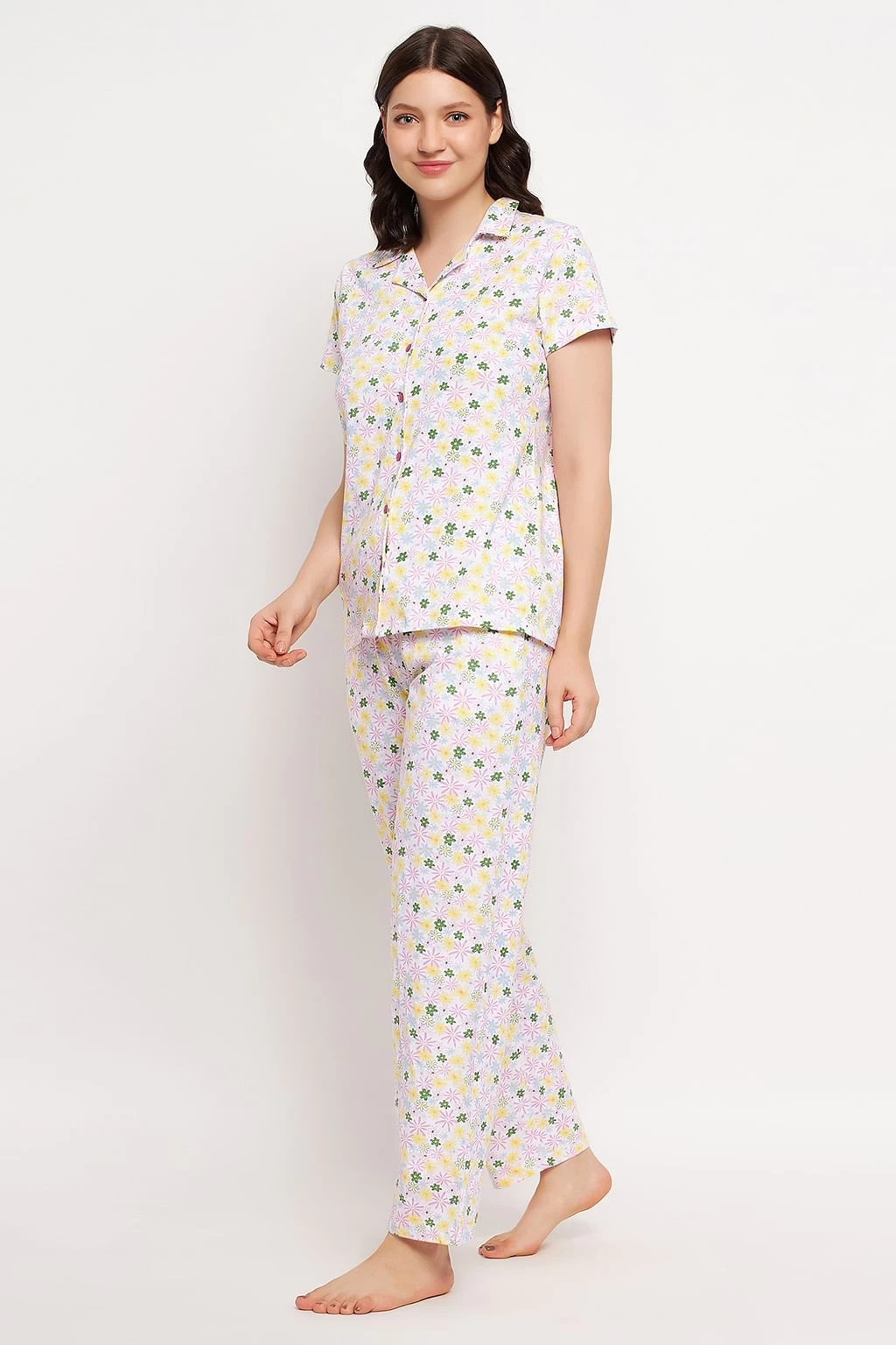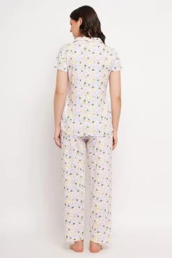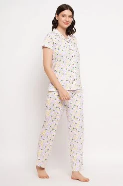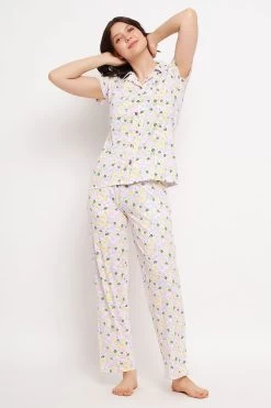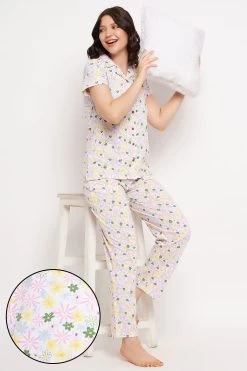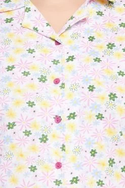 Pretty Florals Button Down Shirt & Pyjama Set In White – 100% Cotton