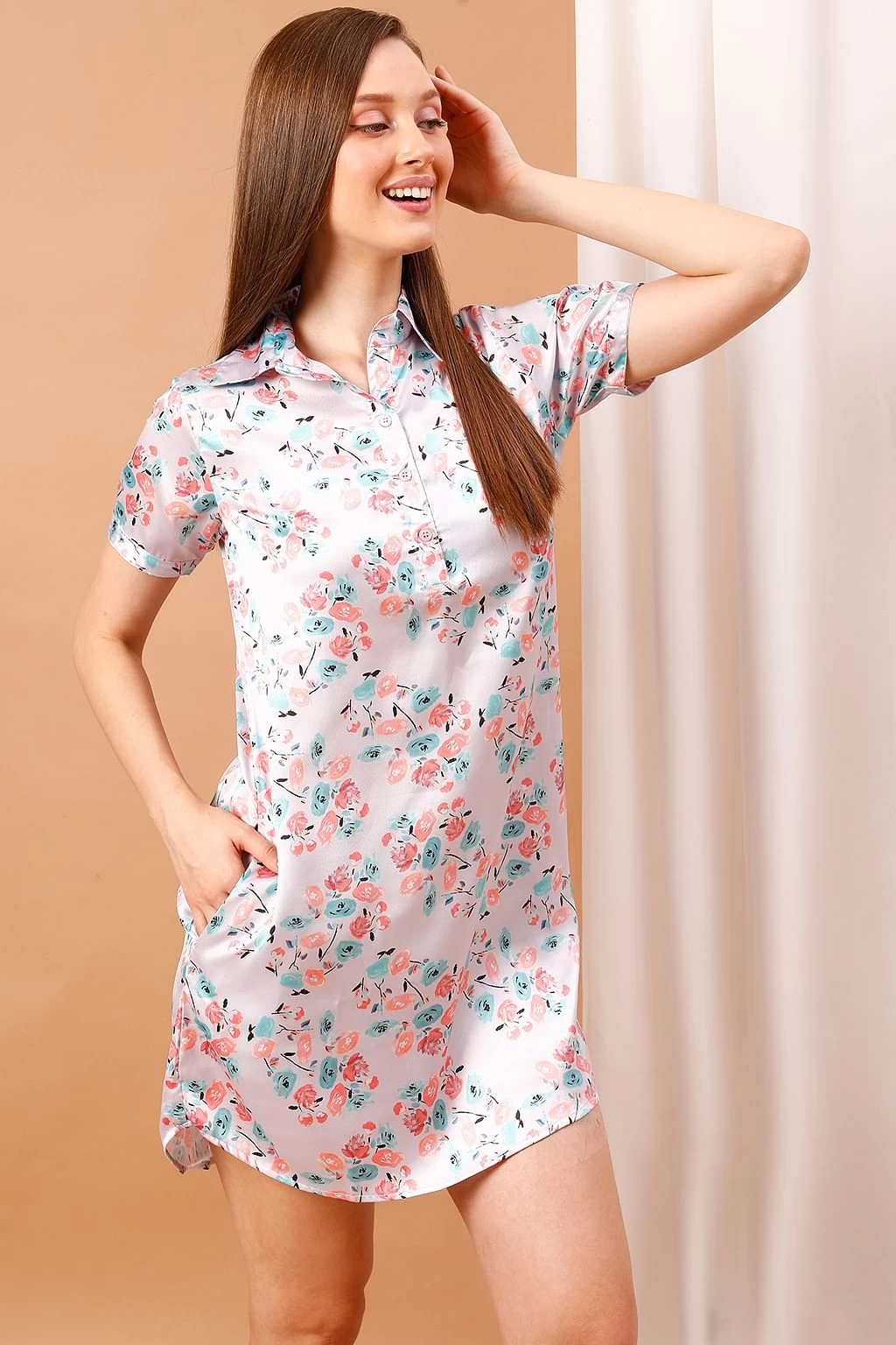 Light grey button down sleep shirt crafted with butter-soft comfortable satin fabric.
