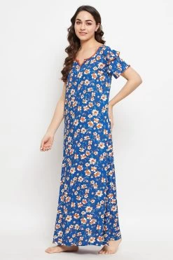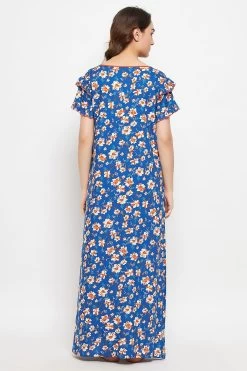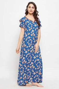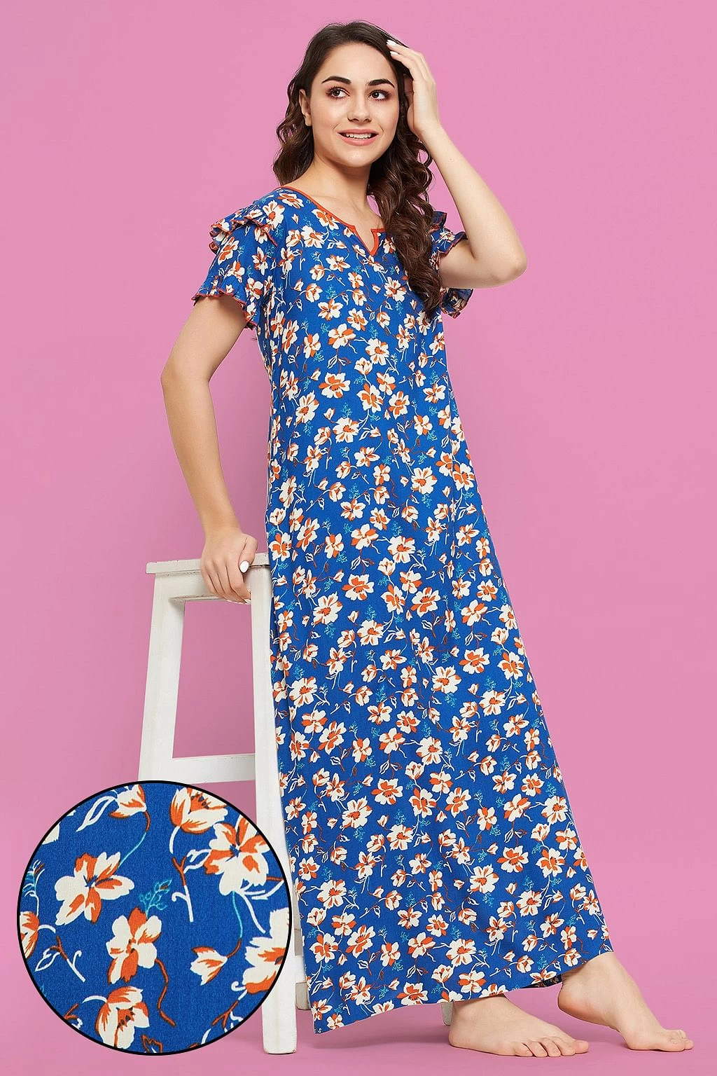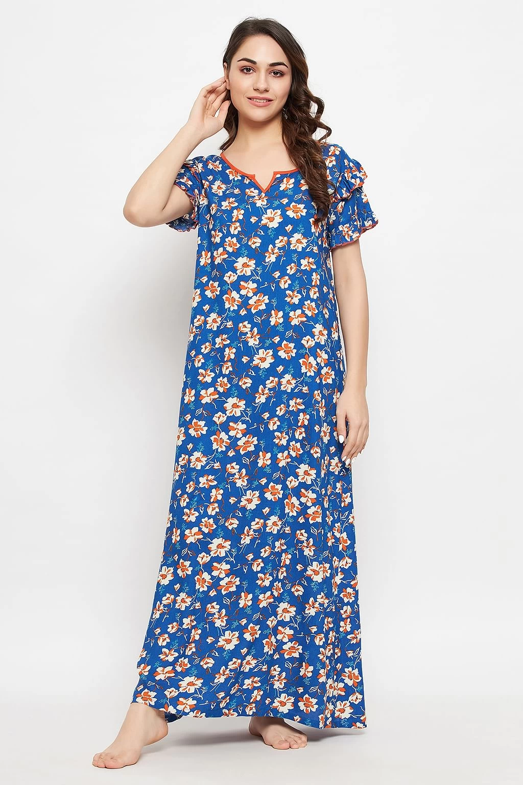Pretty Florals Long Night Dress In Royal Blue – Rayon