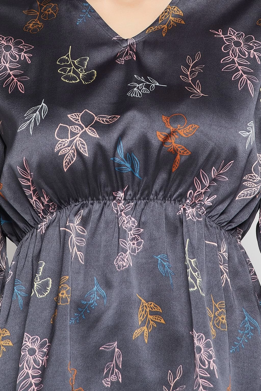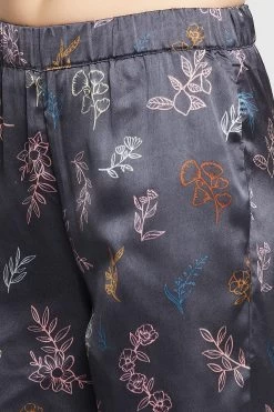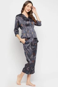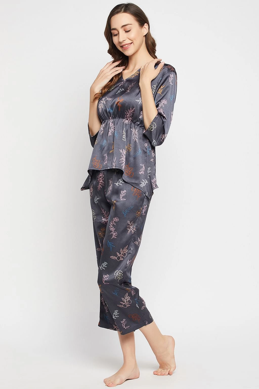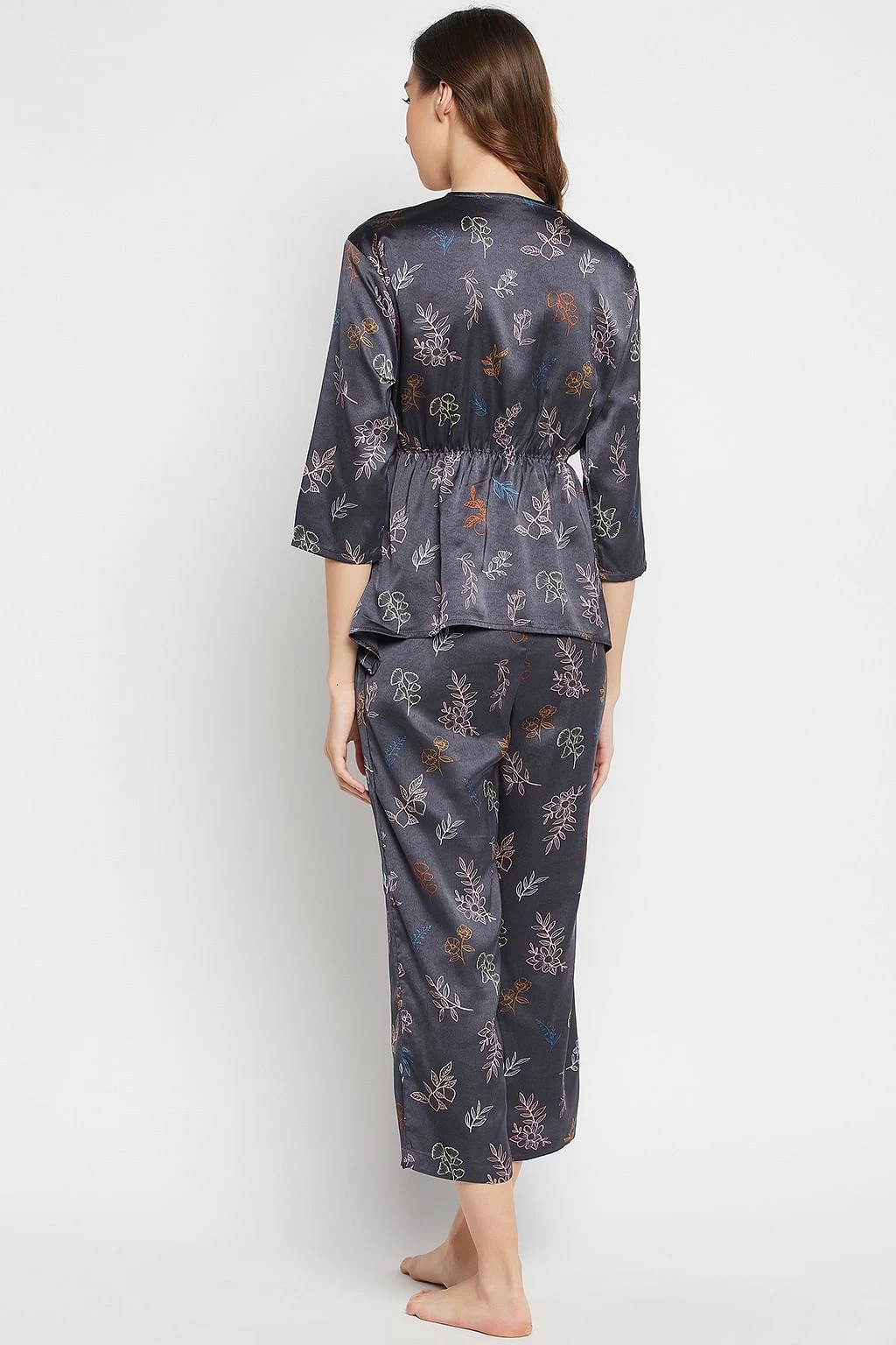 Pretty Florals Peplum Top & Pyjama Set In Dark Grey – Satin