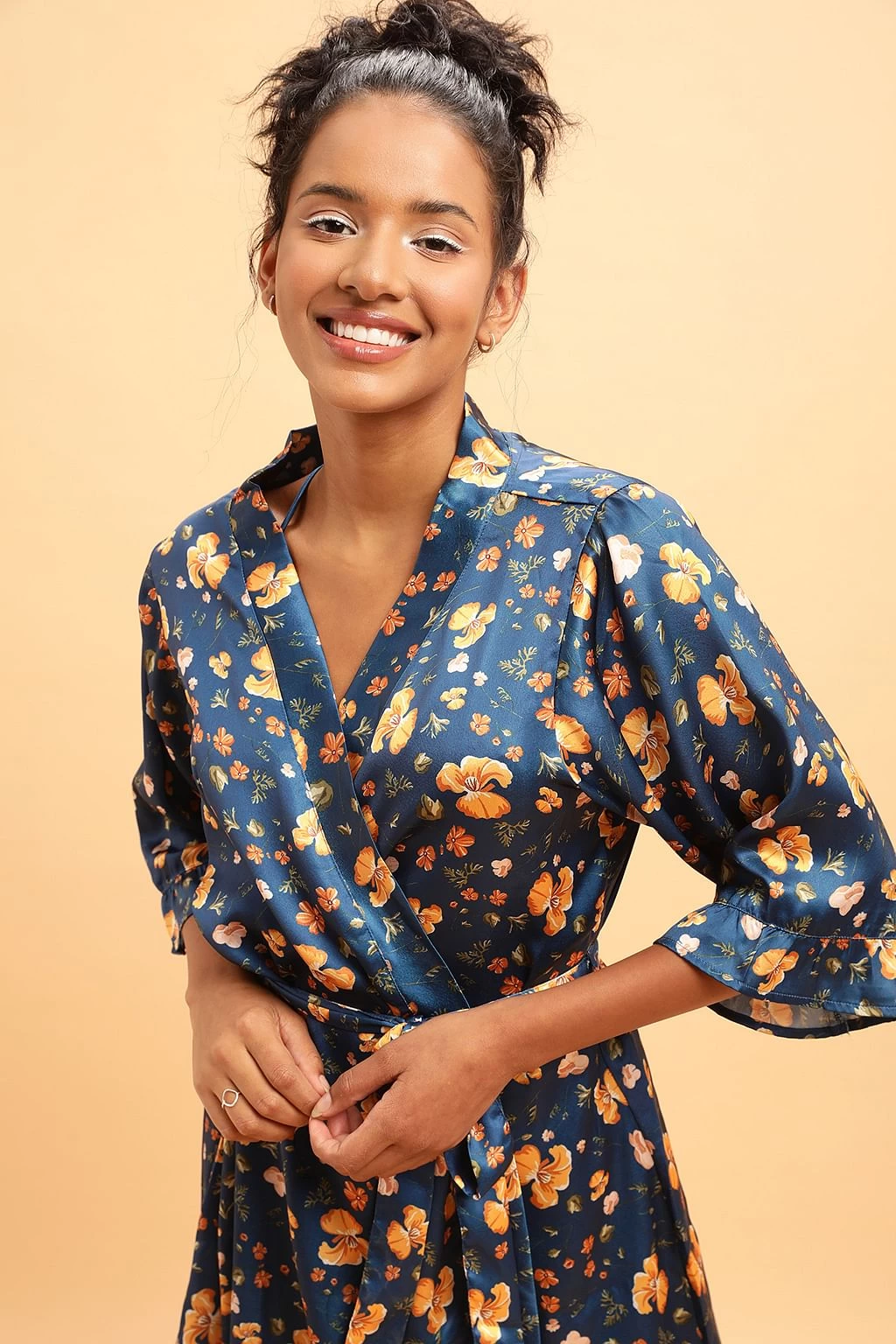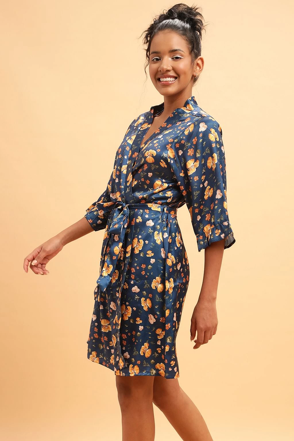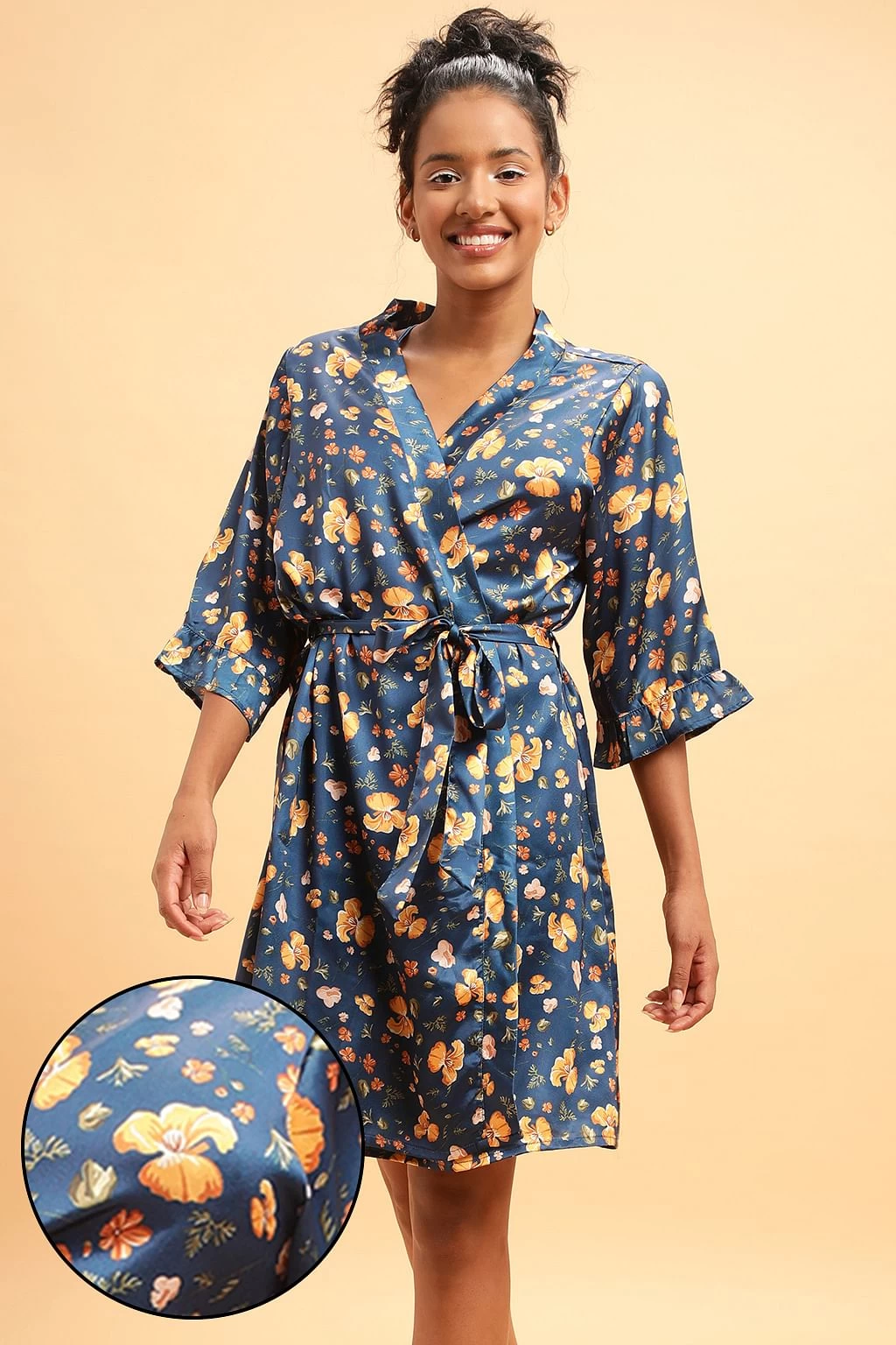 Has 3/4th sleeves with ruffled edges & matching tie-up belt at the waistline.