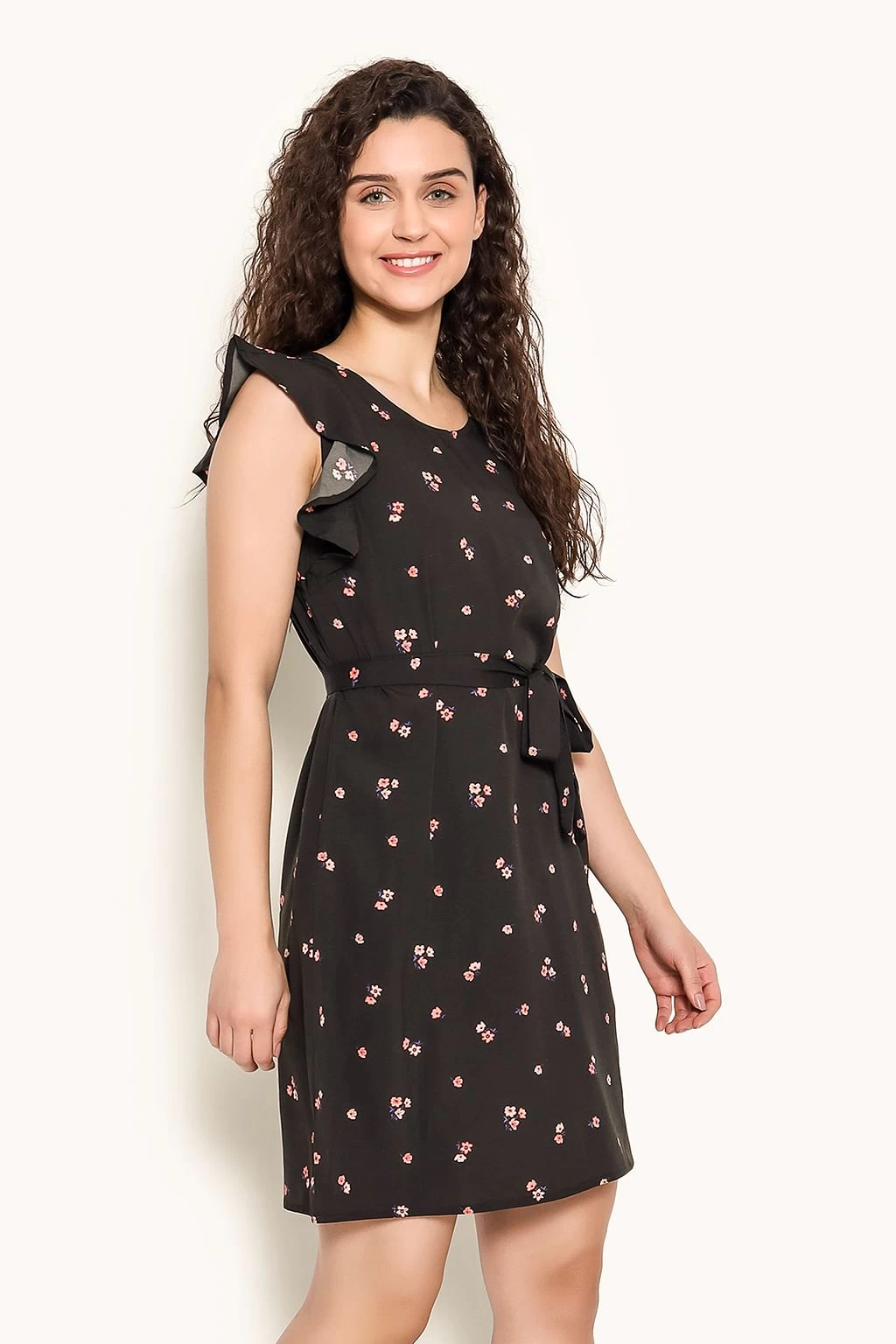 Has frills on both sides that form short sleeves.