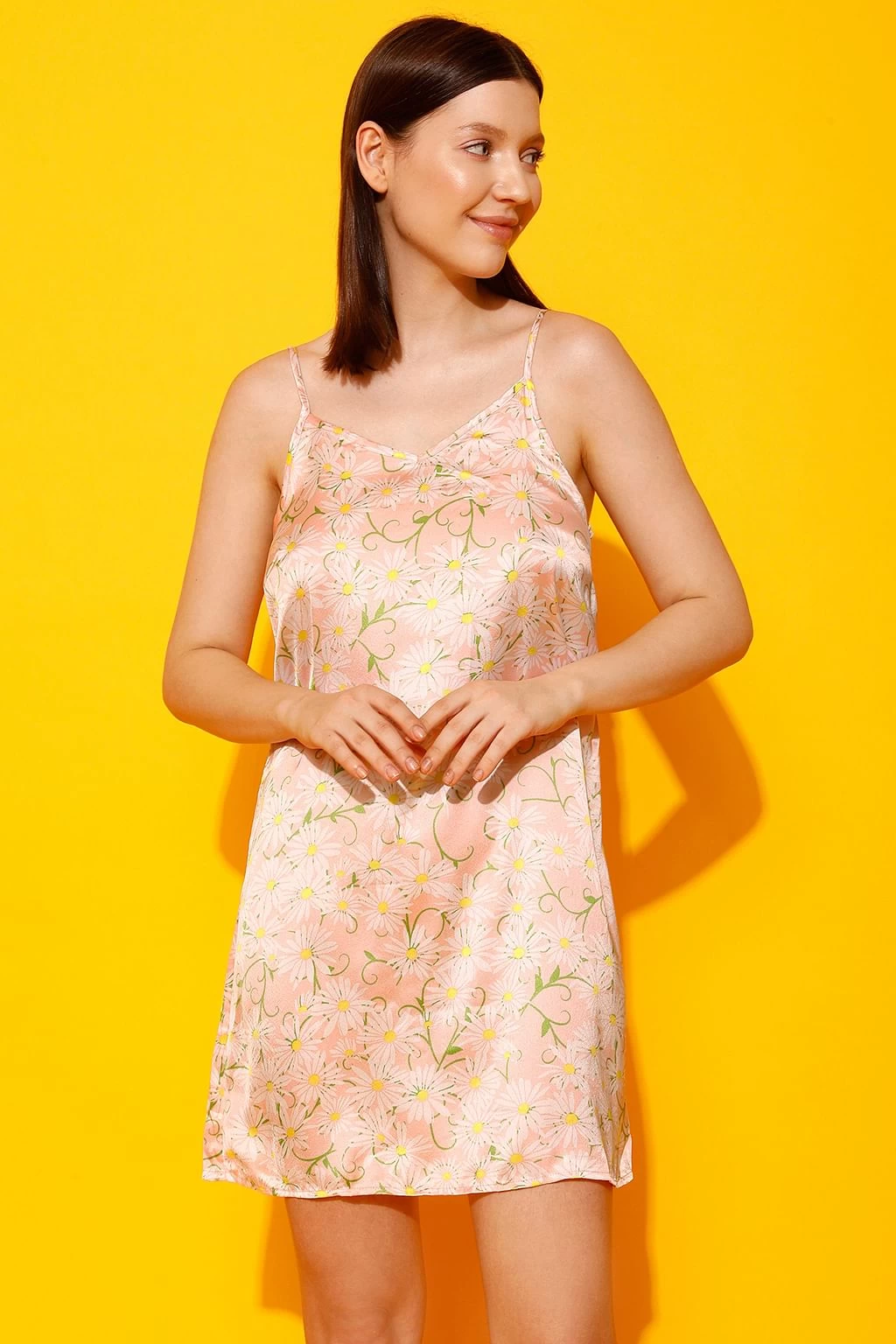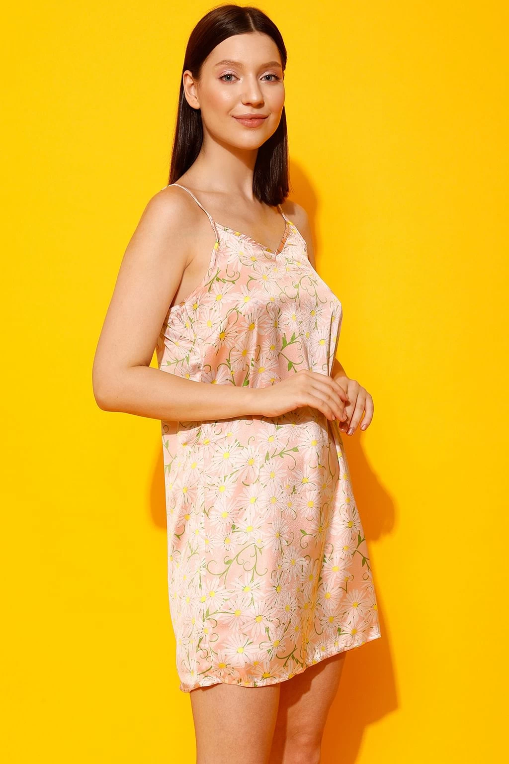 Night dress has a deep V-neckline, deep elasticated back & adjustable spaghetti straps.