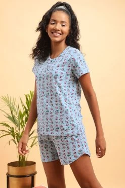 Pretty Florals Top & Shorts Set In Cornflower Blue – 100% Cotton