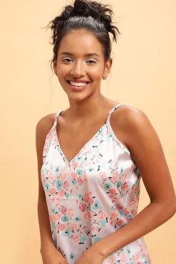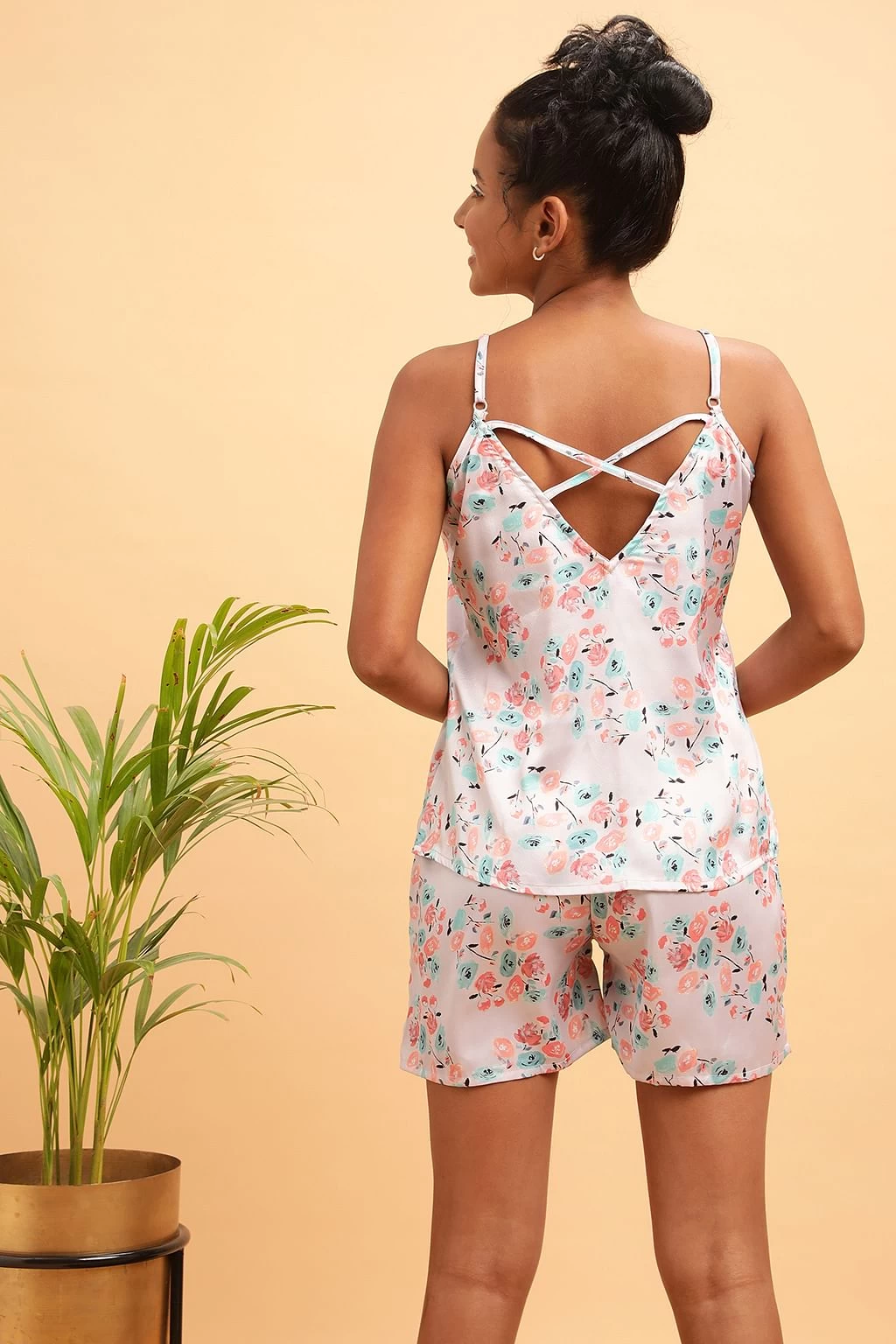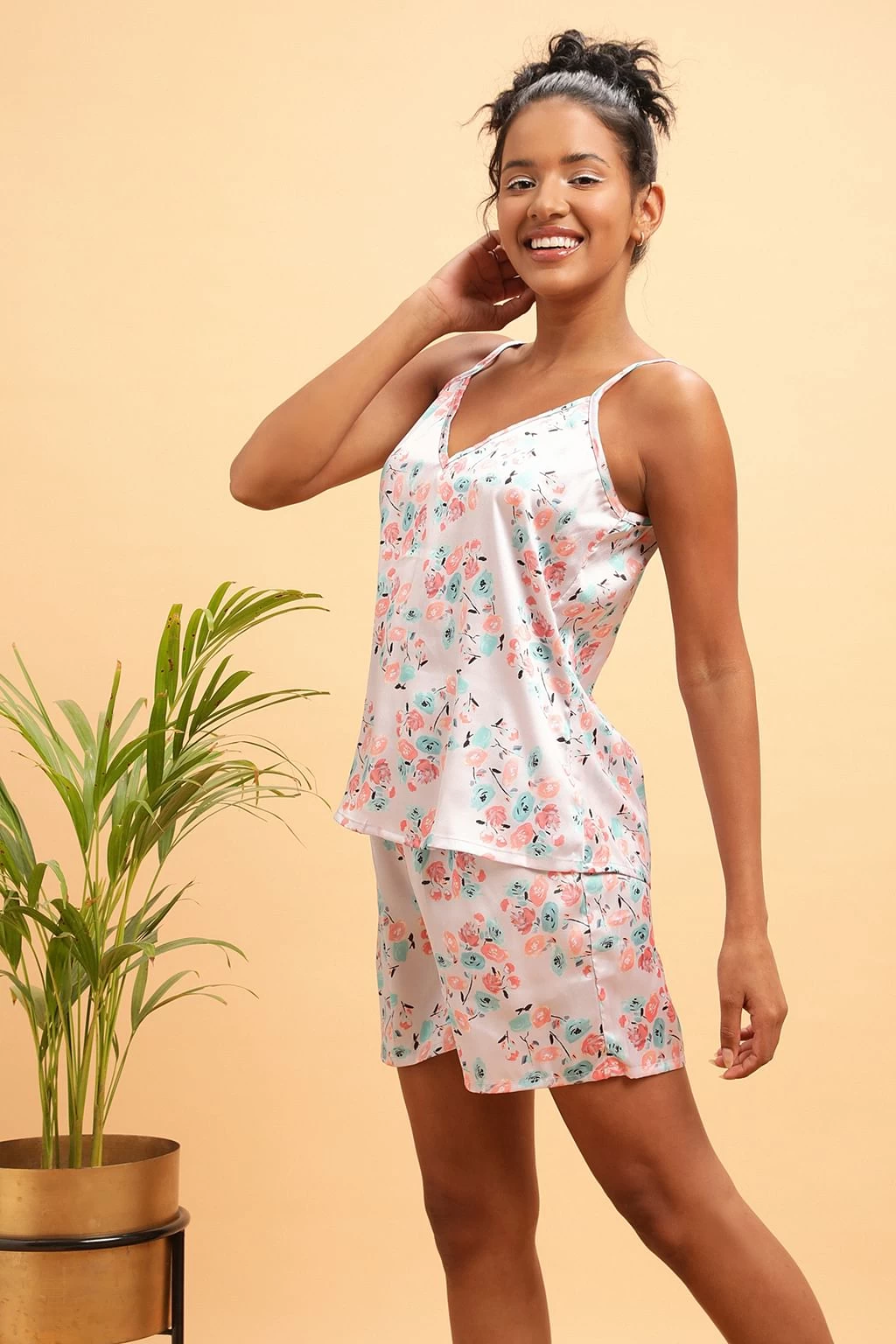 Light grey cami top & shorts set crafted with soft satin fabric.