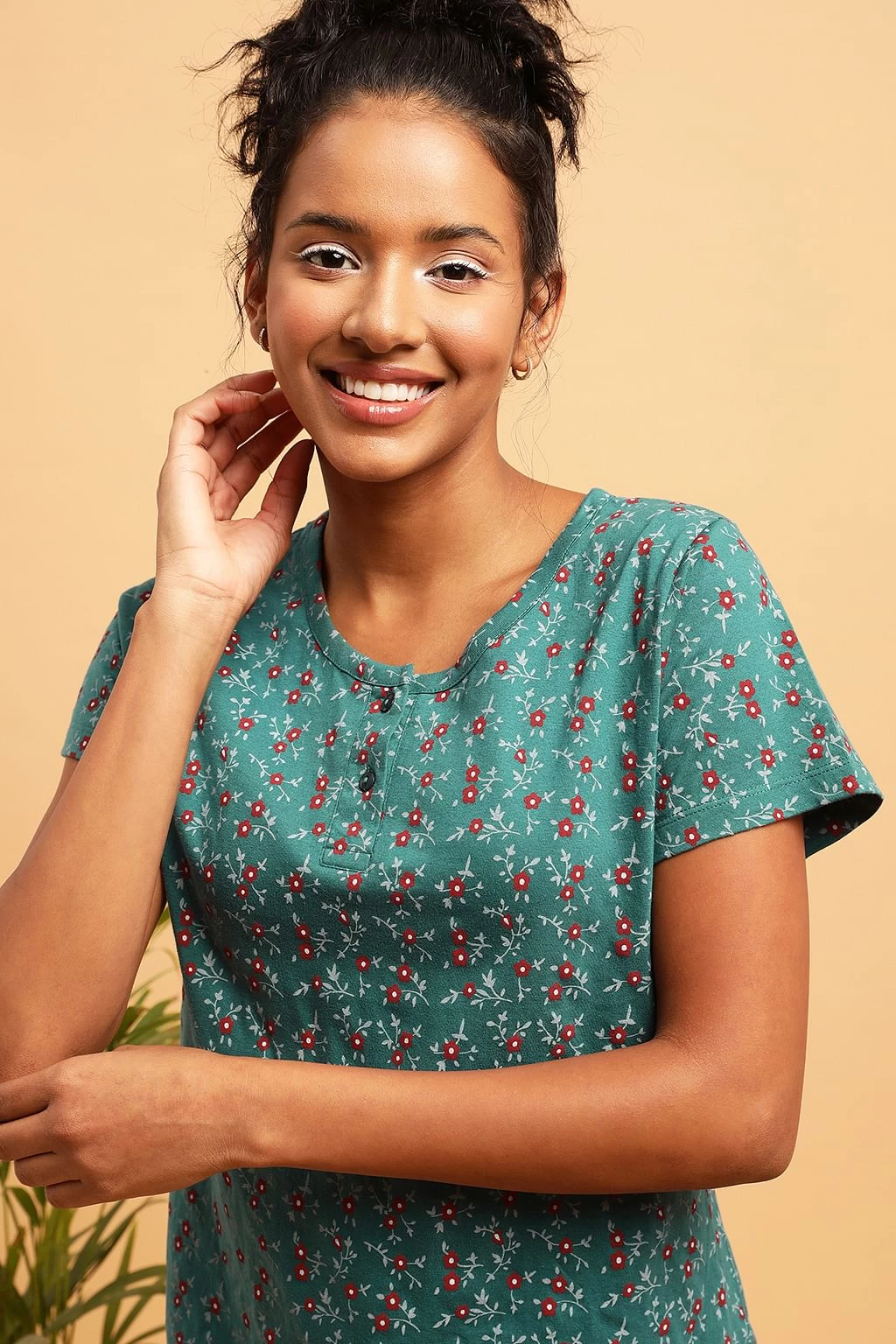 Top has round neckline with short button placket & short sleeves.