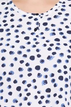 White top designed with navy dot print all over.