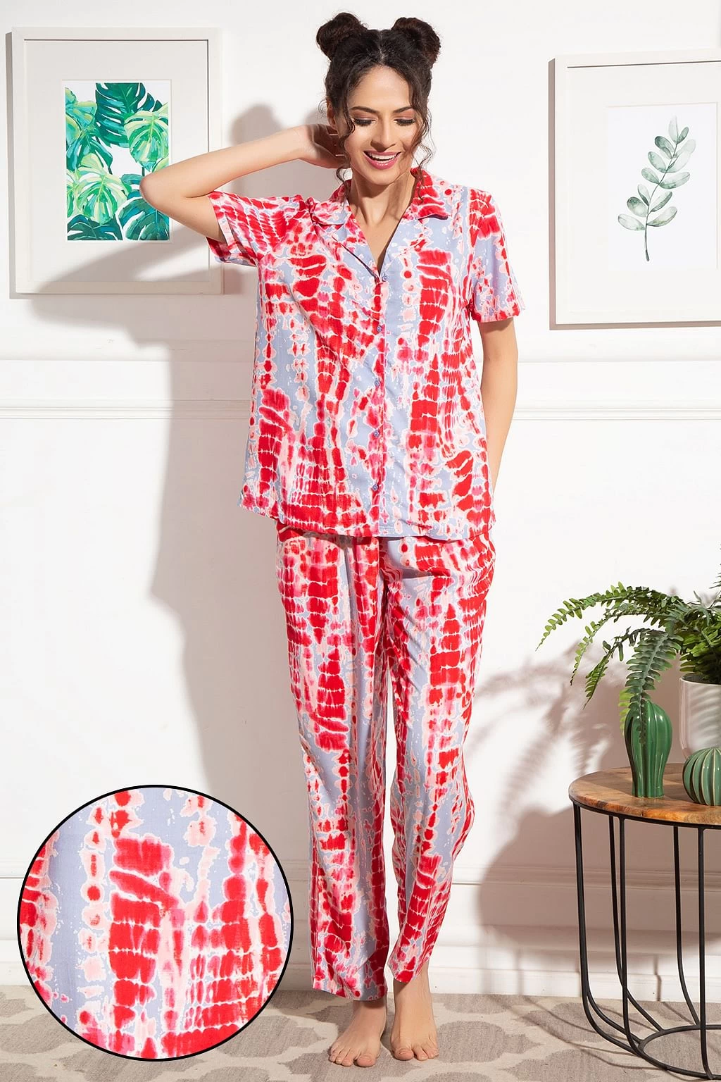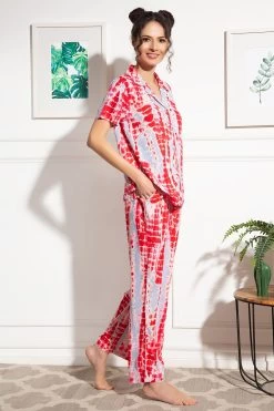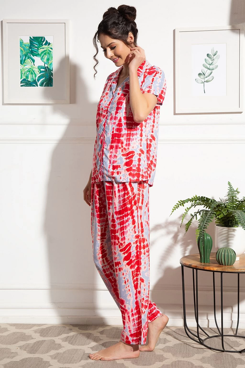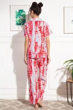 Dark pink button-down shirt & pyjama set crafted with breathable & comfortable rayon fabric.