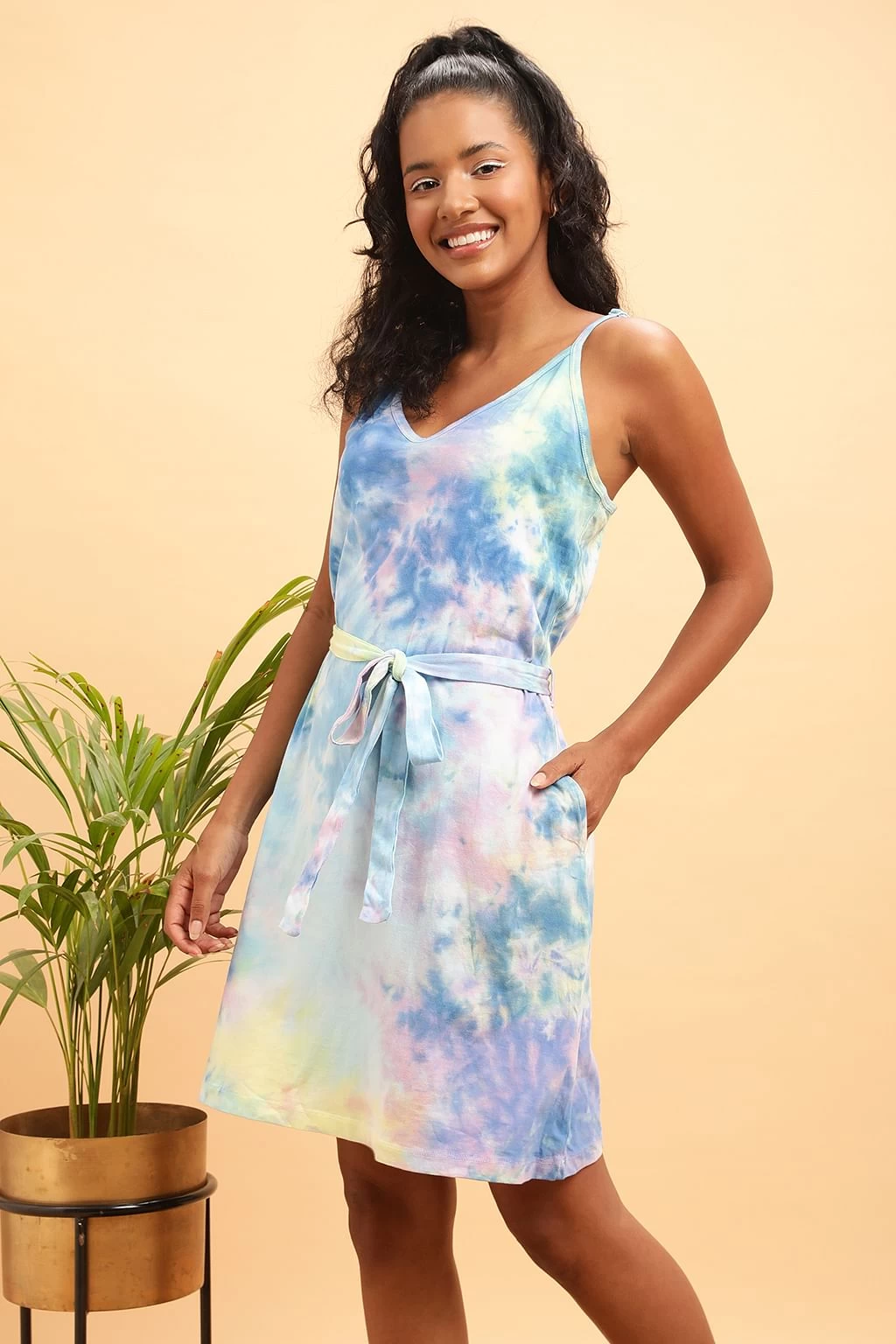 Designed with blue, pink & yellow tie-dye print all over.