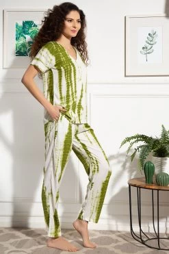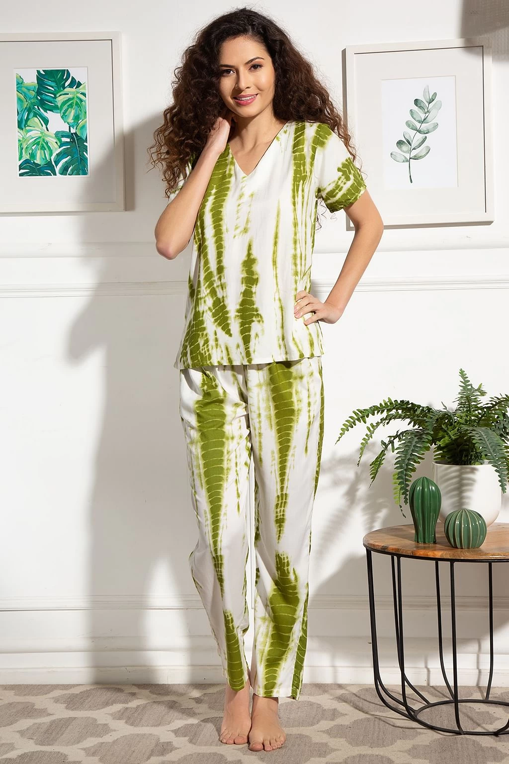 Olive green & white tie-dye print top & pyjama set crafted with soft rayon fabric.