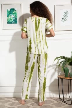 Tie-Dye Print Top & Pyjama Set In Olive Green – Rayon