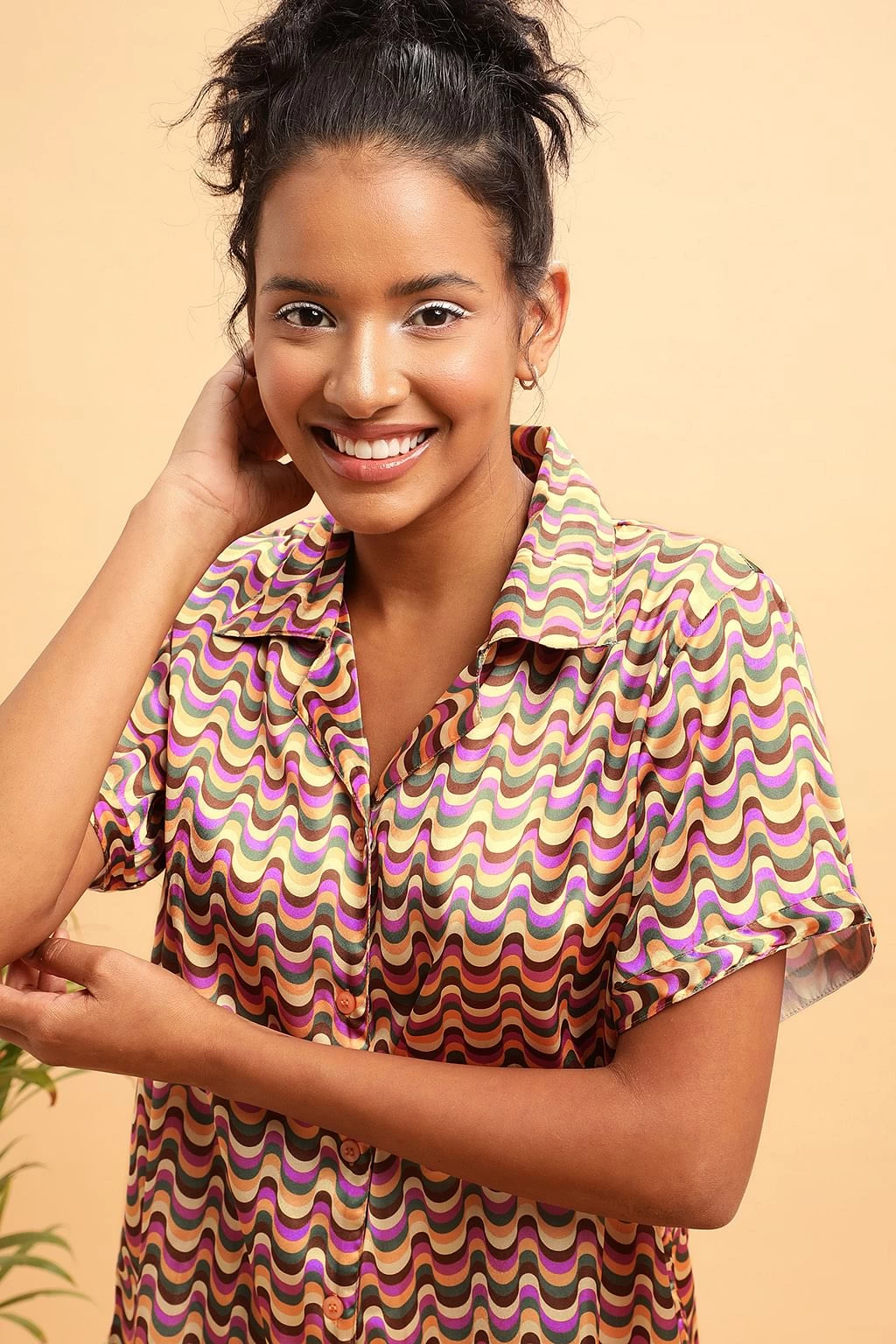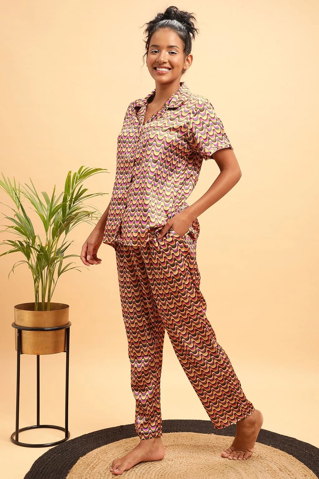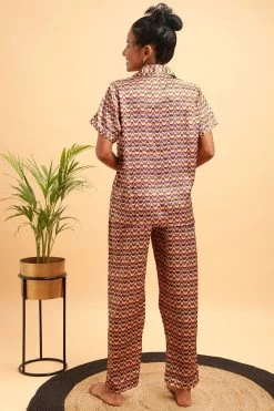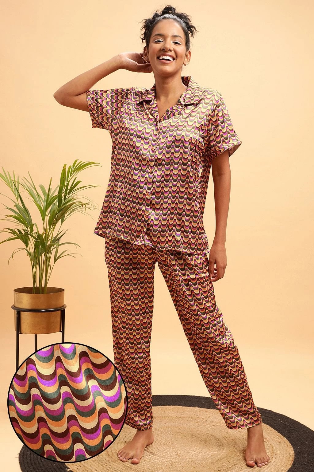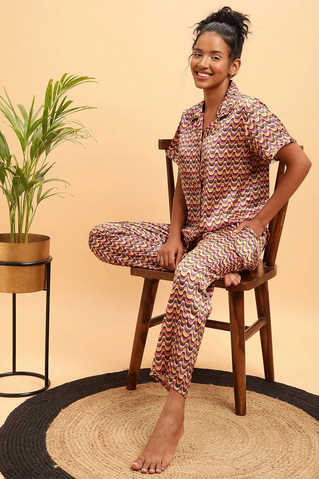 Multicoloured button-down shirt & pyjama set crafted with butter-soft comfortable satin fabric.