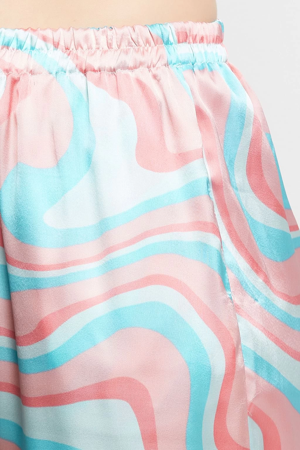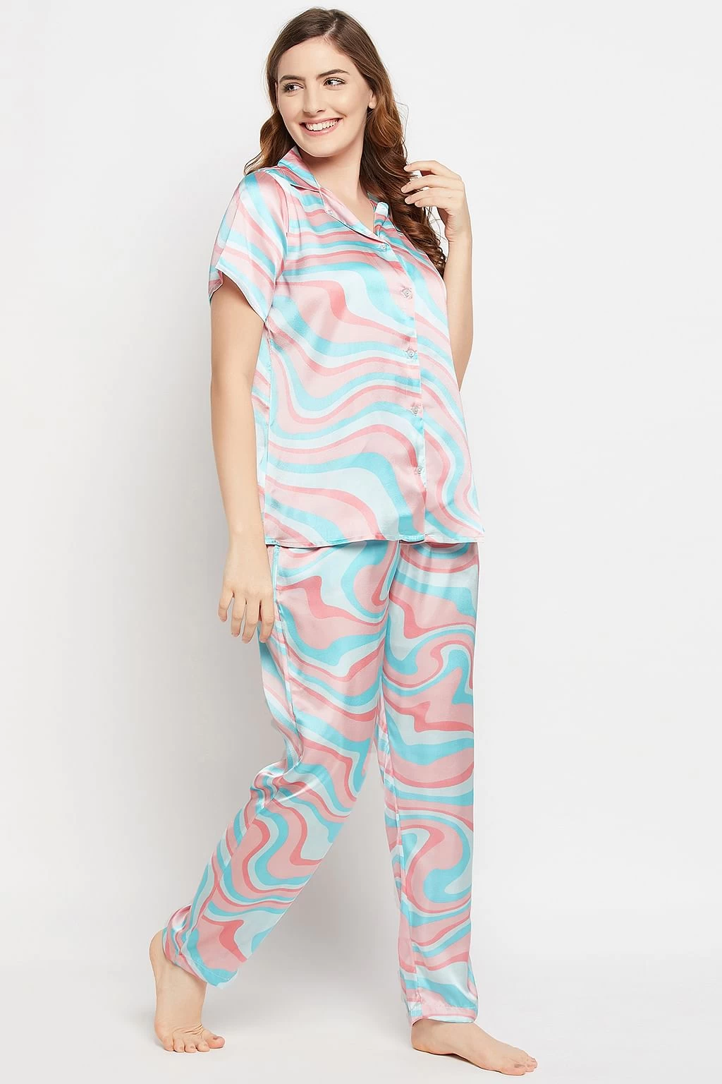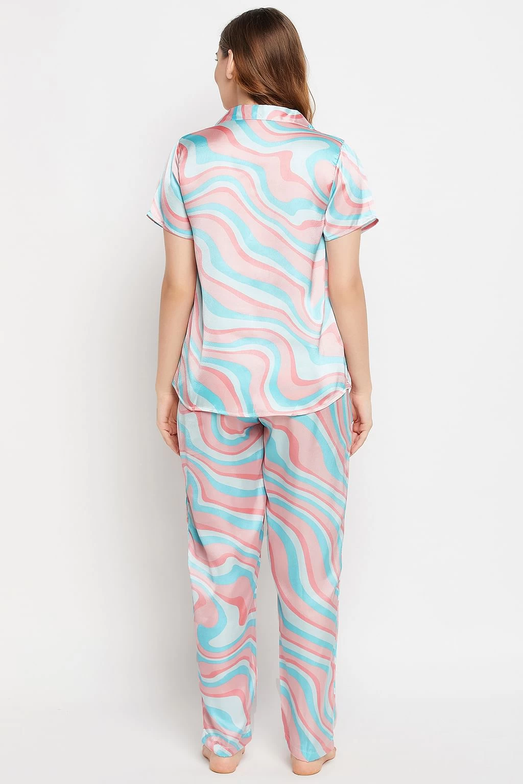 Y2K Print Button Down Shirt & Pyjama Set In Sky Blue – Satin
