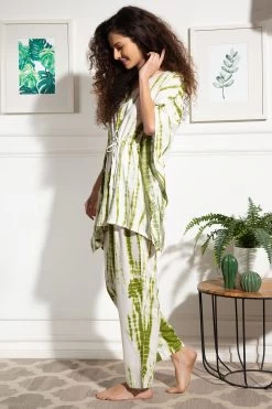Tie-Dye Print Kaftan Top & Pyjama Set In Olive Green – Rayon