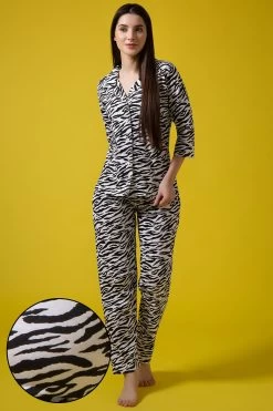 Zebra Print Button Down Shirt & Pyjama Set In White – 100% Cotton